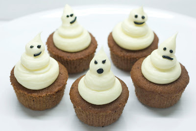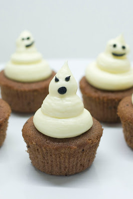 Halloween está cerca y cualquier excusa es buena para preparar unos cupcakes y más si son de chocolate con frosting de queso fresco. Esta vez, aprovechando las fechas, están decorados en forma de «terroríficos» fantasmas. Bueno, en realidad de terroríficos no tienen mucho, como diría mi sobrina parecen fantasmas simpáticos…