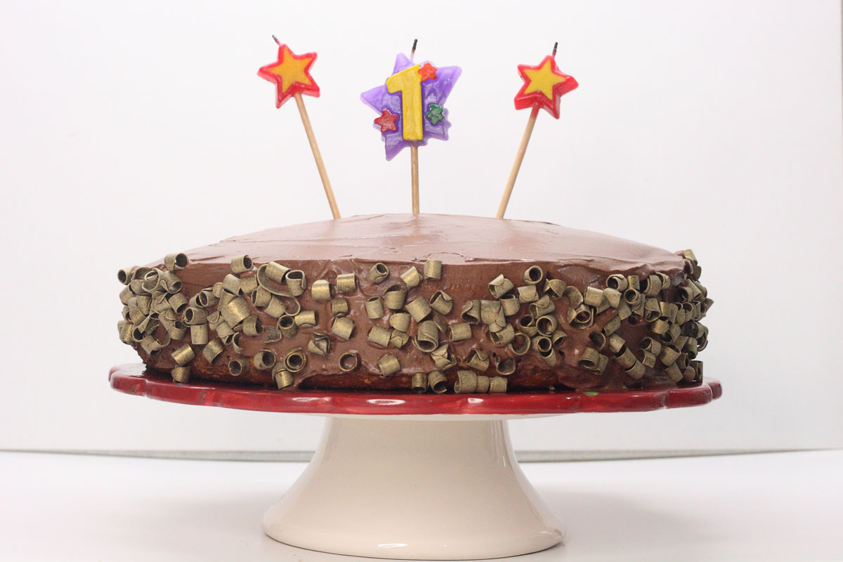 Hoy hace un año de la primera entrada de este blog y, aunque suene a tópico, parece que fue ayer cuando decidimos empezar a compartir con todo el que quiera visitarnos nuestras dulces creaciones. Aprovechando el aniversario, a parte de este pastel de bizcocho de nata relleno de buttercream de queso crema y cubierto de buttercream de chocolate, hemos decidido regalarnos un cambio de look para el blog. Esperamos que os guste.