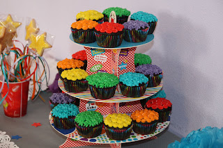 La tarta es un bizcocho de vainilla (receta de Objetivo cupcake perfeto aquí, aunque cambiando el limón por vainilla) relleno de buttercream de fresa y cubierto con buttercream de los colores del arco iris.