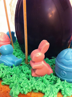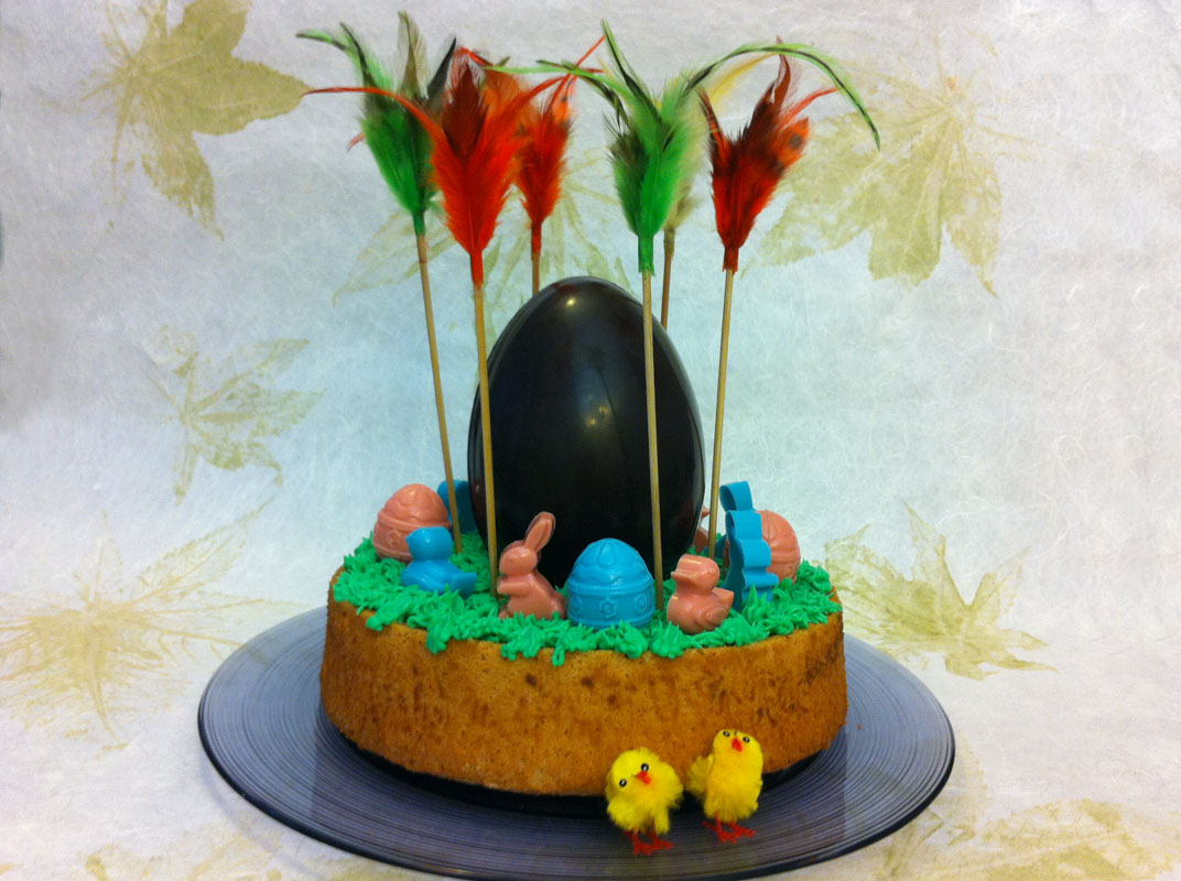 Como marca la tradición, el lunes de Pascua los padrinos tienen que regalar la mona a sus ahijados y yo, como madrina de mi sobrina Laia le he regalado este peculiar pastel de mona. La base de bizcocho es un angel food cake (para la receta podéis pinchar aquí), cubierto de buttercream y decoraciones de conejitos, pollitos y huevos de chocolate rosa, azul y negro, para todos los gustos!