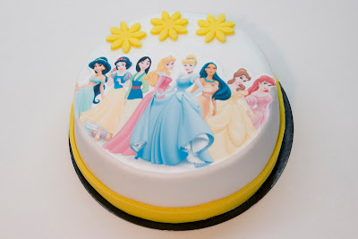 Bizcocho de chocolate relleno de mermelada de fresa, cubierto por una fina capa de fondant y decorado con flores de fondant y oblea de papel de azúcar con motivo de princesas Disney.